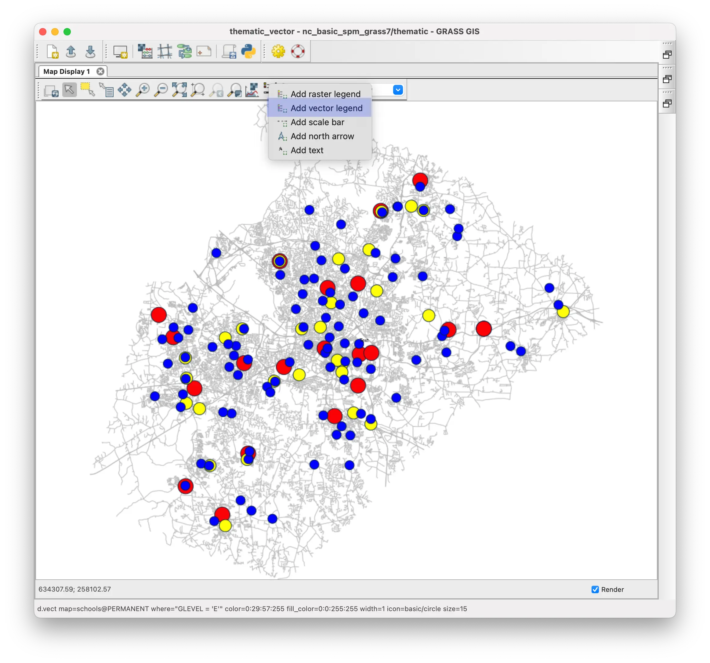 A legend can help you and other users better interpret the colored circles on the map. You can create a vector legend with the vector legend tool, d.legend.vect, that you can access from the button bar at the top of the map display window.